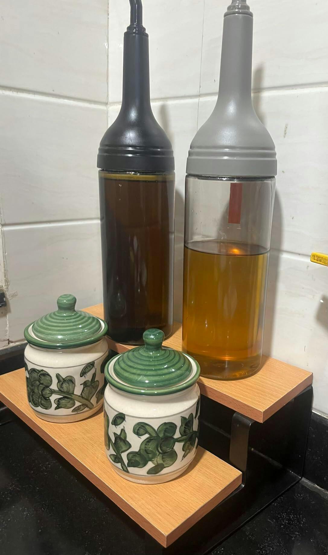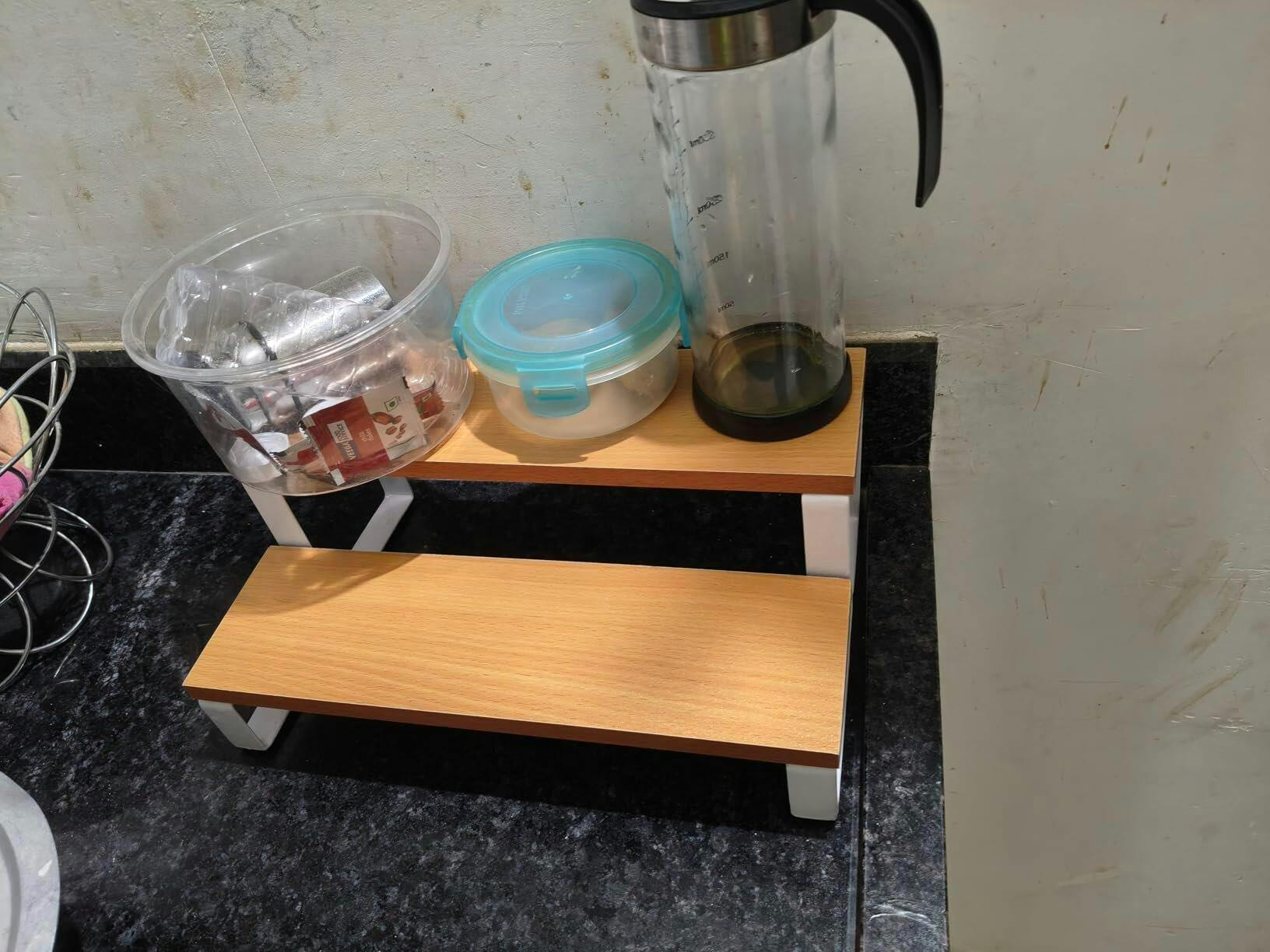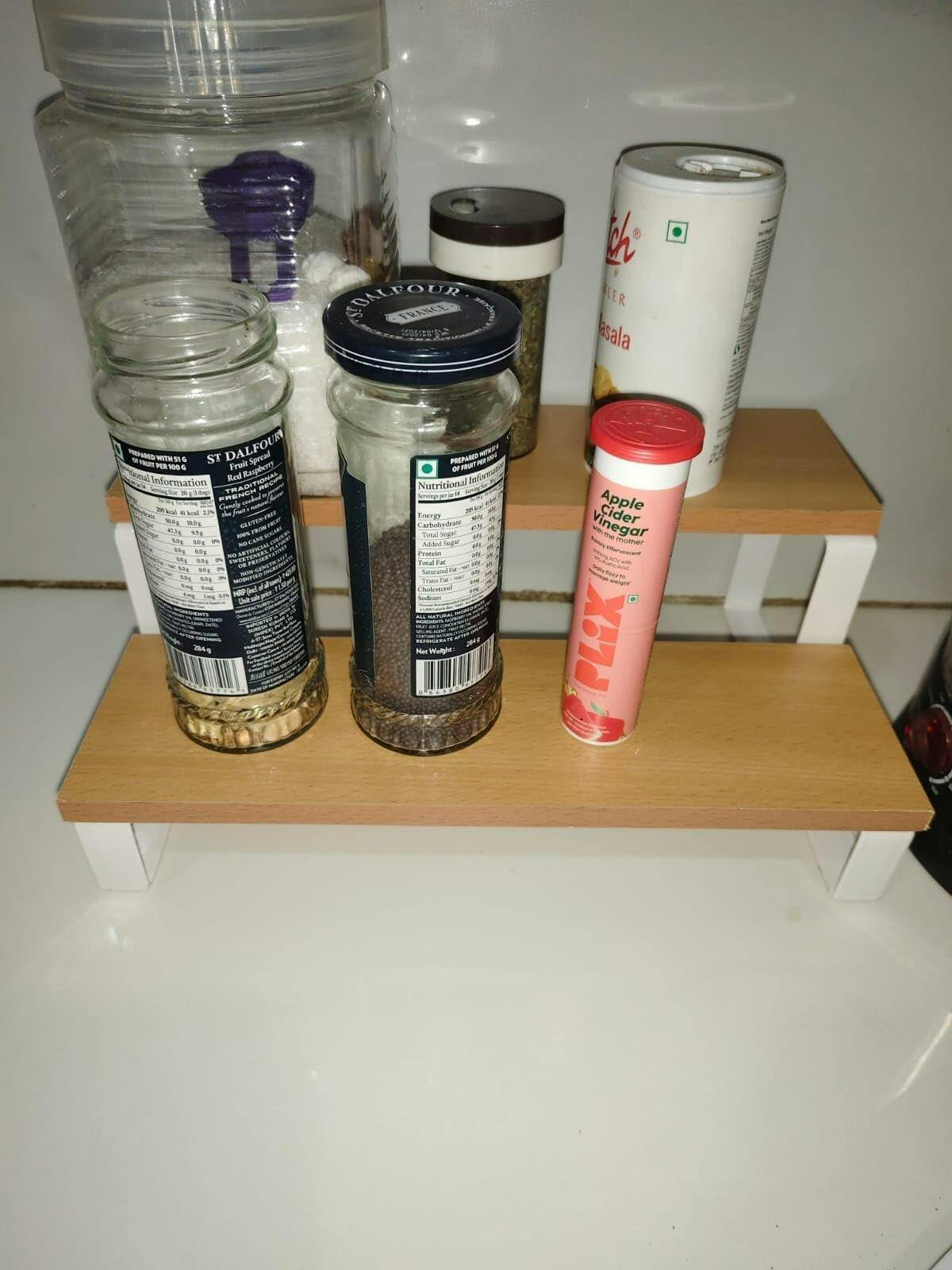 2-tier metal and laminated board organizer for spices or cosmetics. Ideal for kitchen countertops, pantries, or cupboards. Stylish, durable, and space-saving storage solution.