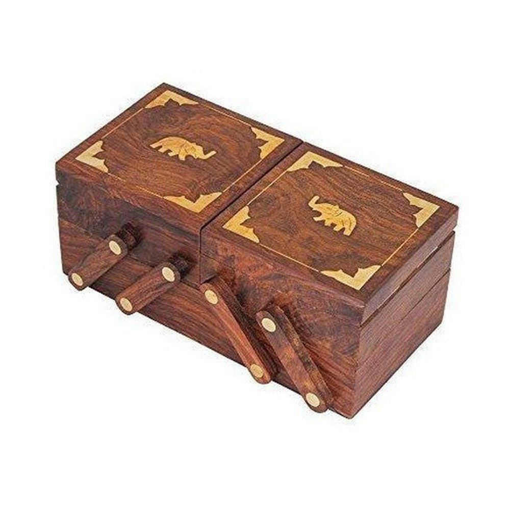 Adorned with an exquisite brass elephant inlay, this handcrafted wooden jewelry box is a perfect blend of traditional artistry and modern functionality. The floral detailing and polished finish exude charm, while the sturdy wooden build ensures your precious pieces stay organized, scratch-free, and secure. Whether you’re entertaining guests or preparing for a festive season, this box offers a refined way to store your cherished ornaments. It's not just storage—it's a statement piece on your dresser, reflecting a love for art, order, and timeless design.